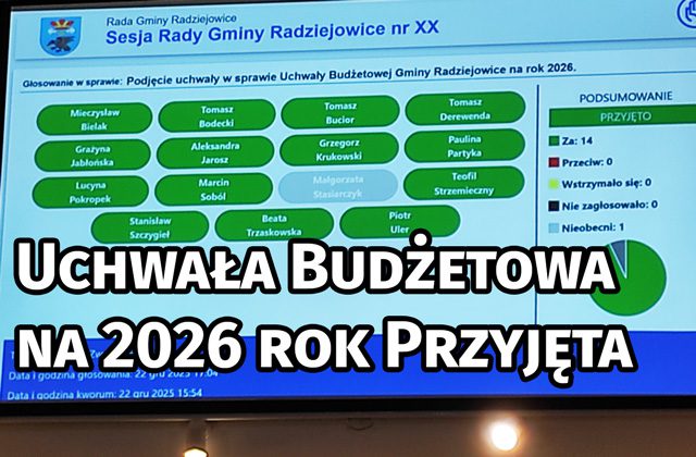 22 grudnia 2025 r. podczas sesji Rady Gminy Radziejowice radni jednogłośnie przyjęli Uchwałę Budżetową na rok 2026. Jest to kluczowy dokument określający priorytety finansowe,...