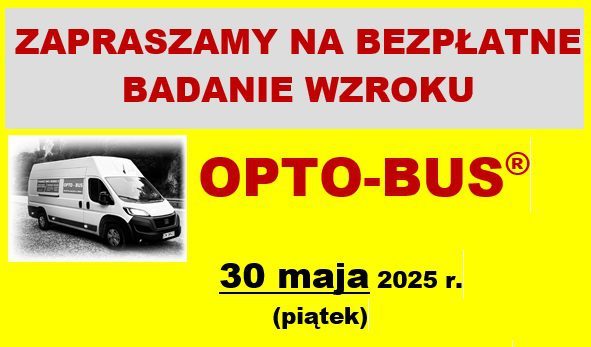OPTO-BUS@30 maja 2025 r.(piątek)RadziejowiceParking przyOśrodku Zdrowiaul. Słoneczna 2w godzinach 11 — 13:00ZAPISY nr tel. 570 407 407BADANIE WYKONYWANE OSOBOM POWYZEJ 15. ROKU ZYCIAOFERUJEMY: